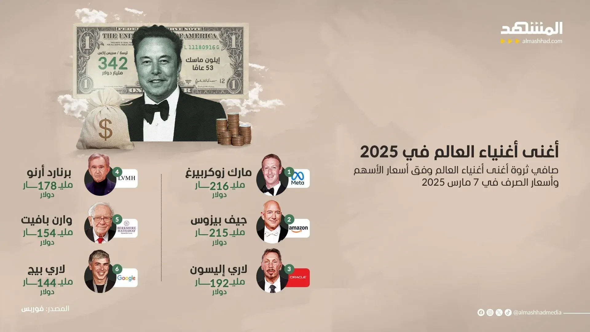 احتفظ رجل الأعمال الأميركي إيلون ماسك (53 عامًا) بلقب أغنى رجل في العالم لعام 2025، بثروة تُقدر بـ342 مليار دولار.