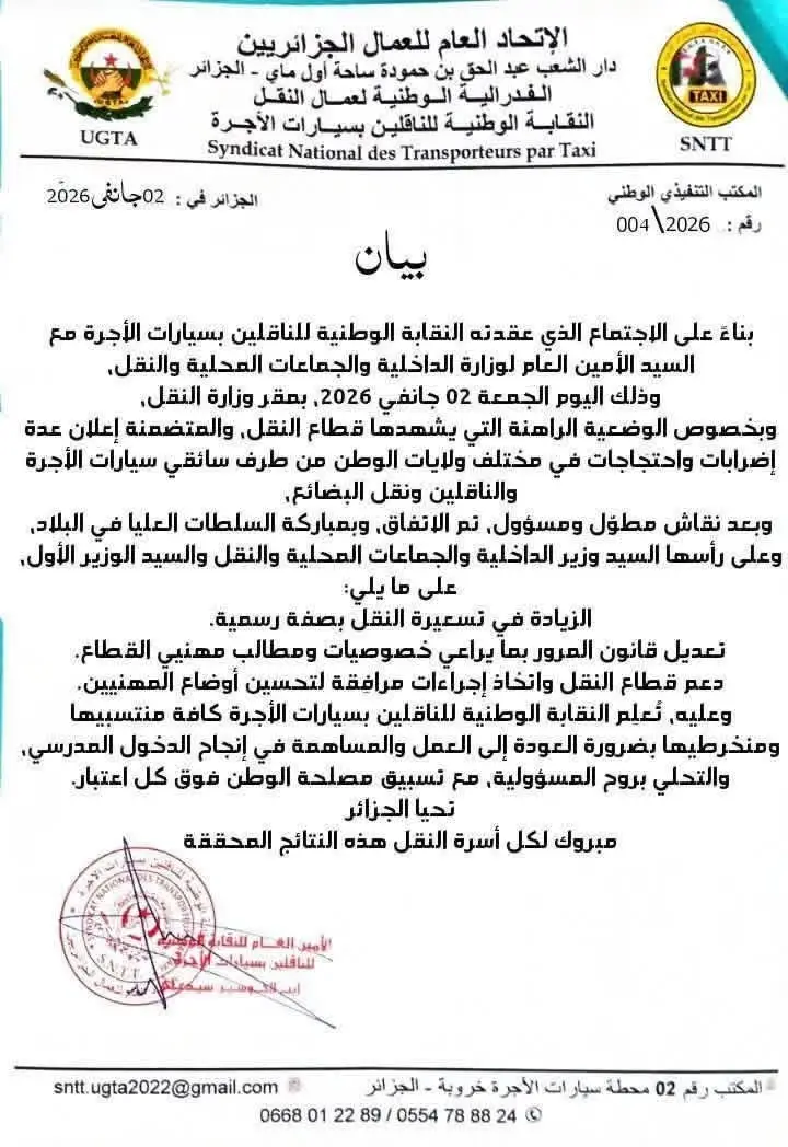 - أن يتم تعديل قانون المرور في الجزائر بما يراعي المطالب الخاصة بالعاملين في قطاع النقل.