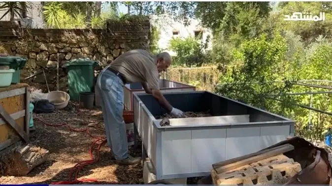 في حديقة منزله الخلفية في بلدة دلهون، يرتب المهندس الزراعي غازي عيسى صناديق وبراميل الدود بعناية ليتخلص من النفايات المنزلية العضوية بطريقة بيئية ويحصل على سماد عضوي بجودة عالية.