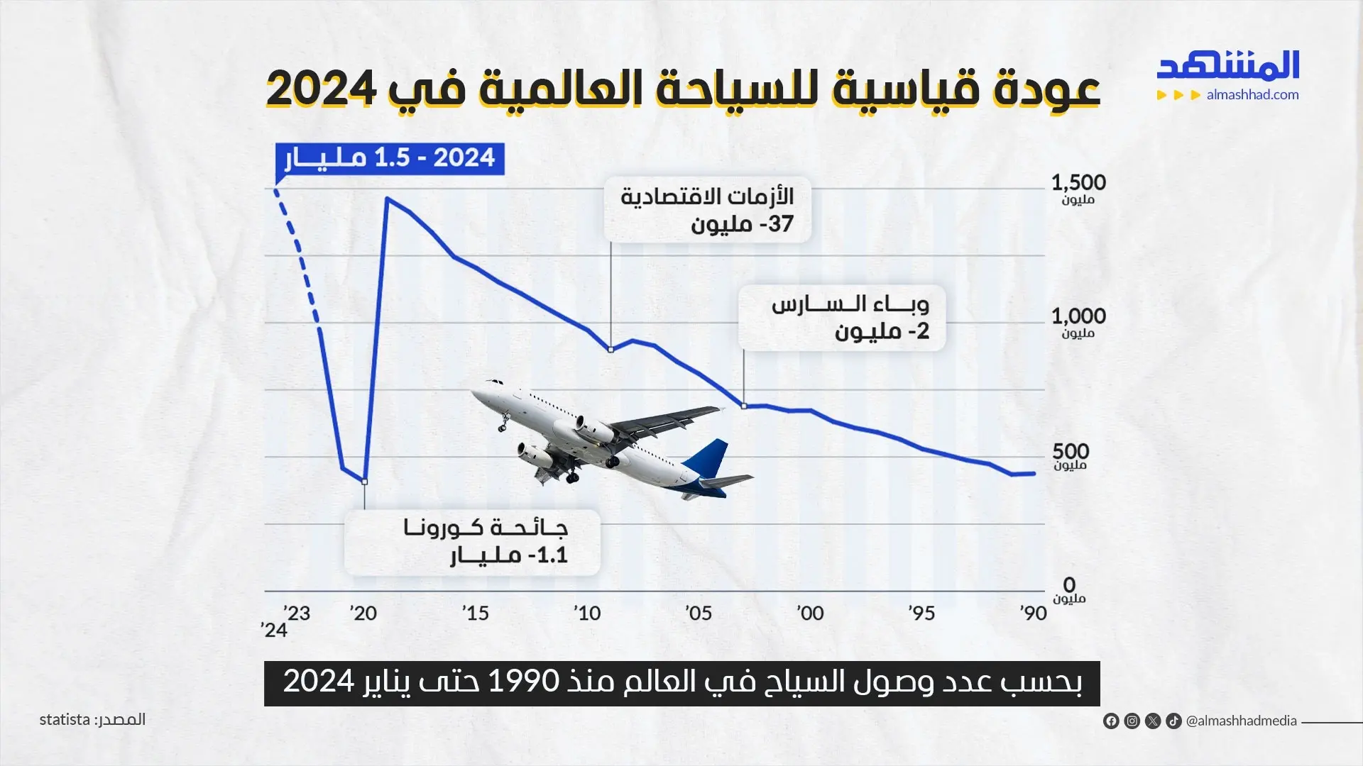 ووفقا لمقياس السياحة العالمية التابع لمنظمة السياحة العالمية، واصلت السياحة العالمية انتعاشها في عام 2023، منهية العام عند 88% من مستويات ما قبل الوباء، مع وصول ما يقدر بنحو 1.3 مليار سائح دولي. كانت إعادة فتح الصين في وقت سابق من عام 2023 بمثابة علامة فارقة أخرى على طريق التعافي الكامل، بعد أن تأخرت المنطقة لفترة طويلة عن بقية العالم.