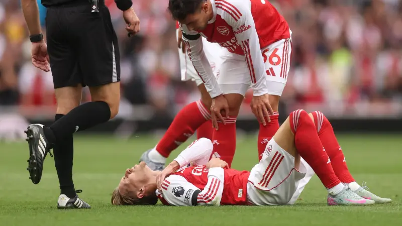 المتاعب لم تتوقف عند إصابة ساكا، إذ كان أرسنال قد تلقى ضربة موجعة منذ الشوط الأول بخروج قائده النرويجي مارتن أوديغارد، الذي كان يخوض مباراته رقم 200 مع الفريق، ليصبح اللاعب رقم 118 في تاريخ النادي الذي يبلغ هذا الرقم.