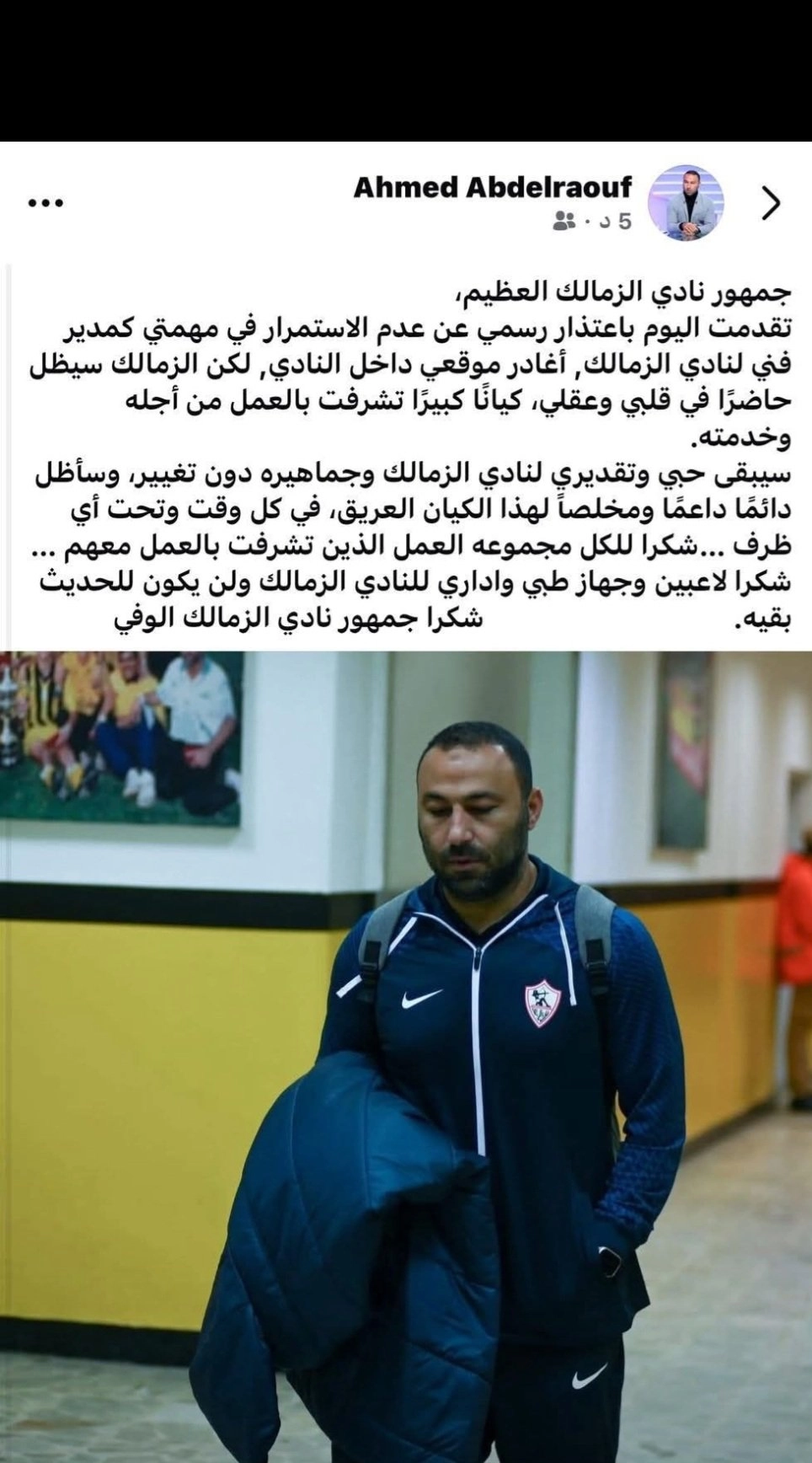 وقال عبد الرؤوف: "أغادر موقعي داخل النادي لكن الزمالك سيظل حاضرًا في قلبي وعقلي، كيانًا كبيرًا تشرفت بالعمل من أجله وخدمته"، موجها الشكر للاعبين والجهازين الطبي والإداري، ومؤكدا بقاء دعمه للنادي وجماهيره.