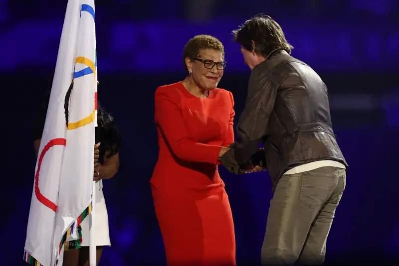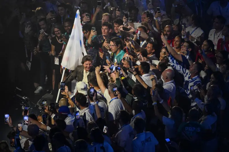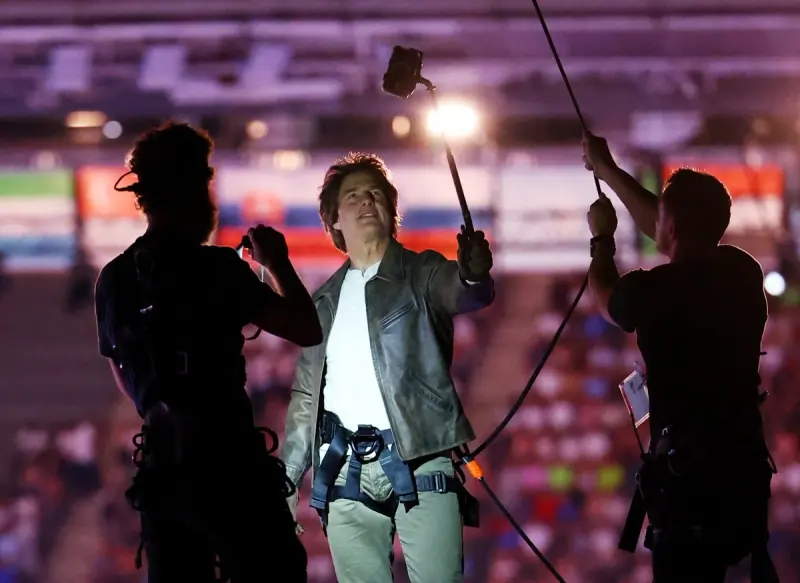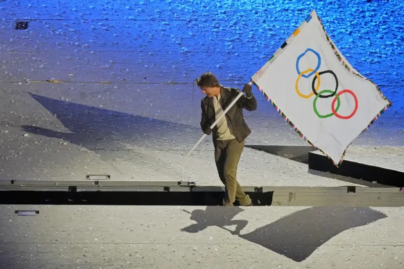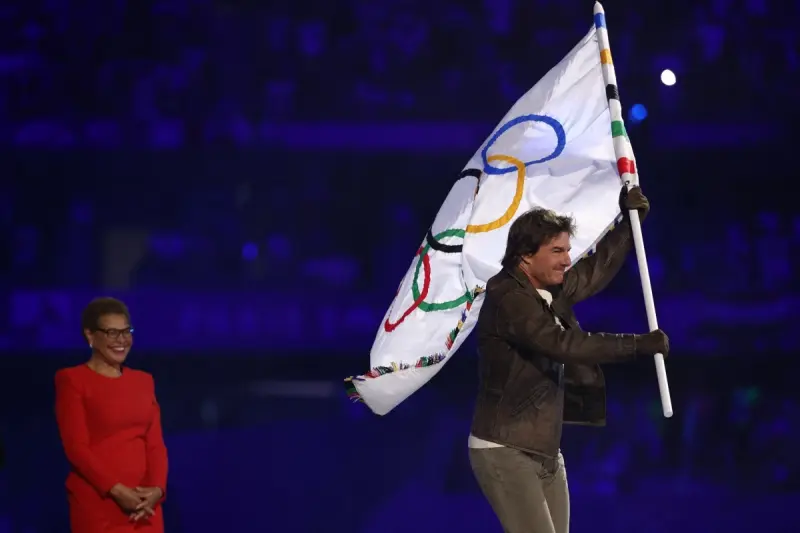 هبط الممثل الأمريكي توم كروز من سقف "ملعب فرنسا" في حفل ختام أولمبياد باريس 2024 قبل أن يحمل العلم الأولمبي بعيدا في مراسم سينمائية درامية لتسليم وتسلم الراية الأولمبية إيذانا ببدء العد العكسي لأولمبياد لوس انجليس 2028.