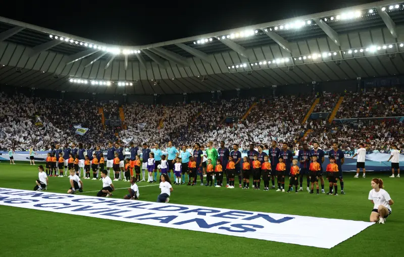 خطى طفلان فلسطينيان من قطاع غزة خطواتهما على أرض ملعب "فريولي" في مدينة أوديني الإيطالية، ليشاركا عن قرب في مراسم تتويج باريس سان جيرمان الفرنسي بلقب كأس السوبر الأوروبي، مساء الأربعاء.