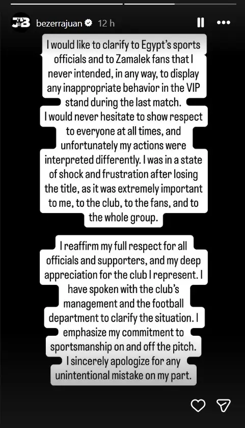 وكتب بيزيرا عبر حسابه الشخصي في موقع "إنستغرام" لتبادل الصور: "أود أن أوضح للمسؤولين الرياضيين المصريين ولمشجعي الزمالك أنني لم أنوِ أبدًا، بأيّ شكل من الأشكال، إظهار أيّ سلوك غير لائق في جناح كبار الشخصيات خلال المباراة الأخيرة".