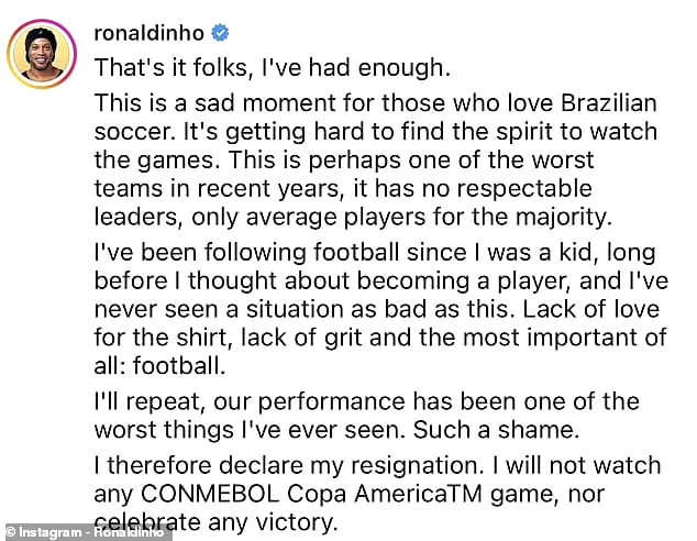وأثار أسطورة البرازيل صدمة الجماهير واللاعبين بانتقاده للمنتخب في بيان شديد اللهجة على وسائل التواصل الاجتماعي، حيث ادّعى أنّ الفريق الحالي هو "أحد أسوأ الفرق في السنوات الأخيرة".