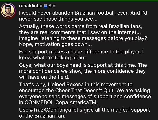 وأضاف رونالدينيو: "يا رفاق ما يحتاجه شبابنا هو الدعم في هذا الوقت. كلما أظهرنا ثقة أكبر، كلما زادت ثقتهم في الملعب".