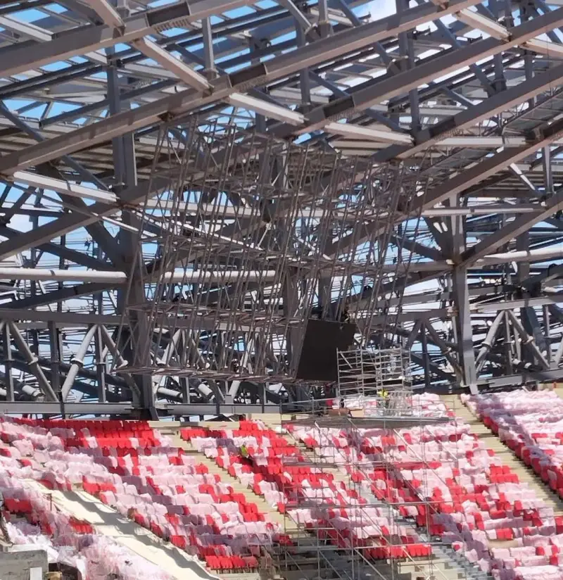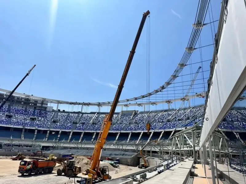 وبحسب معلومات خاصة، فقد تمكن الفريق التقني من استكمال المرحلة الأولى من مشروع رفع السقف بنجاح، لينتقل مباشرة إلى الخطوة التالية التي تشمل تجهيز نظام الكابلات والانطلاق في عملية السحب الثانية لإحدى الحلقات المعدنية، والتي تجعل من السقف ثاني أكبر هيكل من نوعه على المستوى القاري.