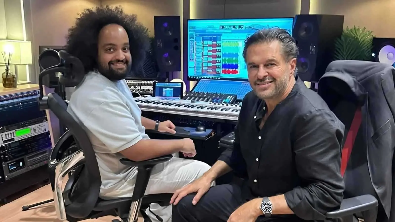 وبدوره شارك الخضري صور عدة لعلامة من داخل الاستوديو، وعلق عليها بالقول إنه يحضر مع النجم الكبير راغب علامة أغاني مهمة جداً جداً.