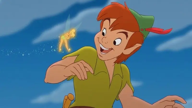 وكان بيتر بان طفل شجاع ومرح لا يريد أن يكبر أبداً، ويطير مع طائرته السحرية عبر السماء ويعيش مغامراته في جزيرة سحرية تُسمى "الجزيرة نيفرلاند"، حيث يجتمع مع العديد من الكائنات الغريبة مثل الهنود الحمر، والساحرات، والقراصنة، وحيوانات نادرة.