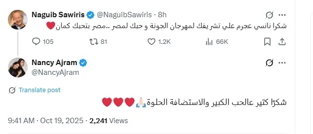 - شكرًا نانسي عجرم على تشريفك لمهرجان الجونة وحبك لمصر .. مصر بتحبك كمان.