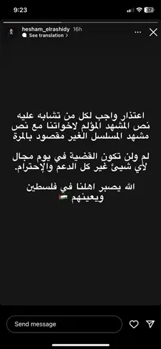 وردًا على الانتقادات، قال المخرج هشام الرشيدي عبر انستغرام: "أعذار واجب لكل من تشابه عليه نص المشهد المؤلم لاخواتنا، مع نص مشهد المسلسل غير المقصود بالمرة"، متابعًا ""لم ولن تكون القضية في يوم مجال لأيّ شيء غير كل الدعم والاحترام. الله يصبّر أهلنا في فلسطين ويعينهم".