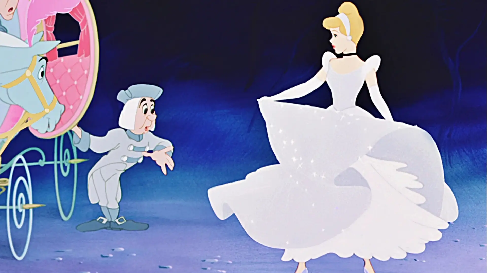 وفي يوم من الأيام، يعلن الملك عن حفل كبير، وتحول عرابة سندريلا الجنية بطريقة سحرية ثيابها البالية إلى ثوب جميل مزود بنعال زجاجية، مما يسمح لها بحضور الحفل، وأثناء حضور سندريلا للحفل، تلفت انتباه الأمير، لكن يجب أن تغادر قبل منتصف الليل عندما يزول التعويذة.