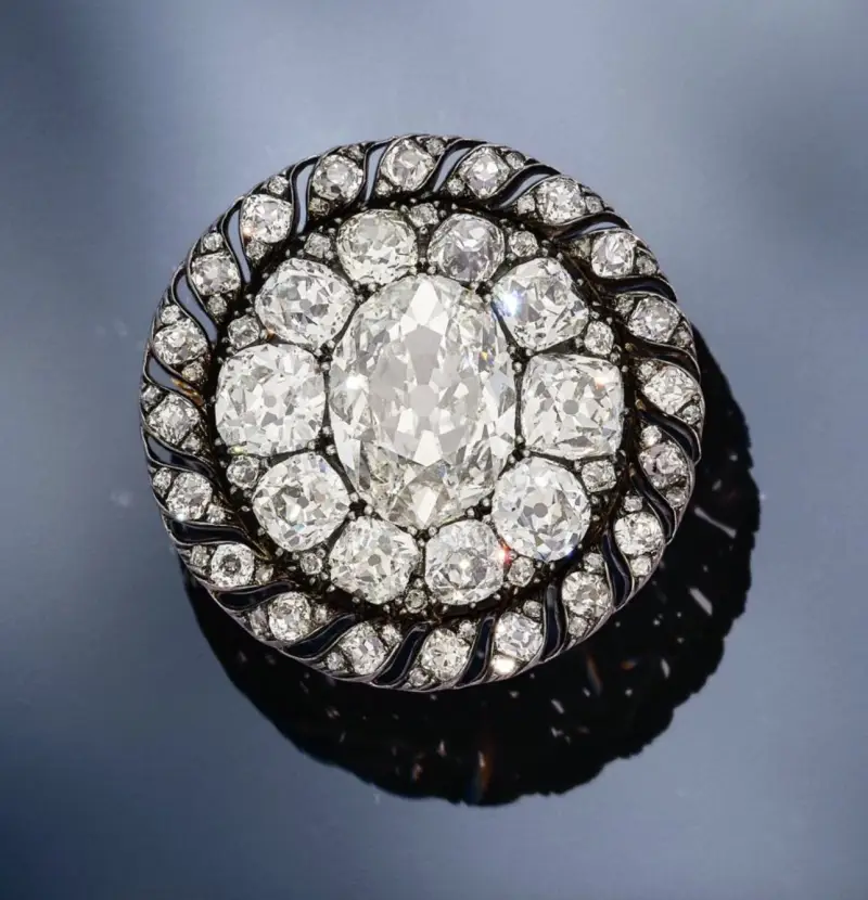 وتتوسط البروش الدائري الذي يبلغ قطره نحو 45 ملّيمترا ماسة بيضوية كبيرة من عيار 13.04 قيراطا، محاطة بنحو 100 ماسة قديمة مقصوصة في المنجم، بأشكال وأحجام مختلفة، مرتبة في صفّين.