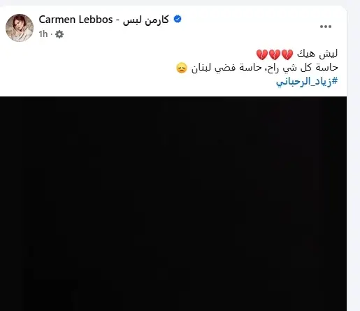 - عبرت النجمة اللبنانية عن صدمتها بوفاة زوجها السابق ونشرت صورة سوداء على حسابها الرسمي على منصة فيسبوك، وأرفقتها بتعليق "ليش هيك".