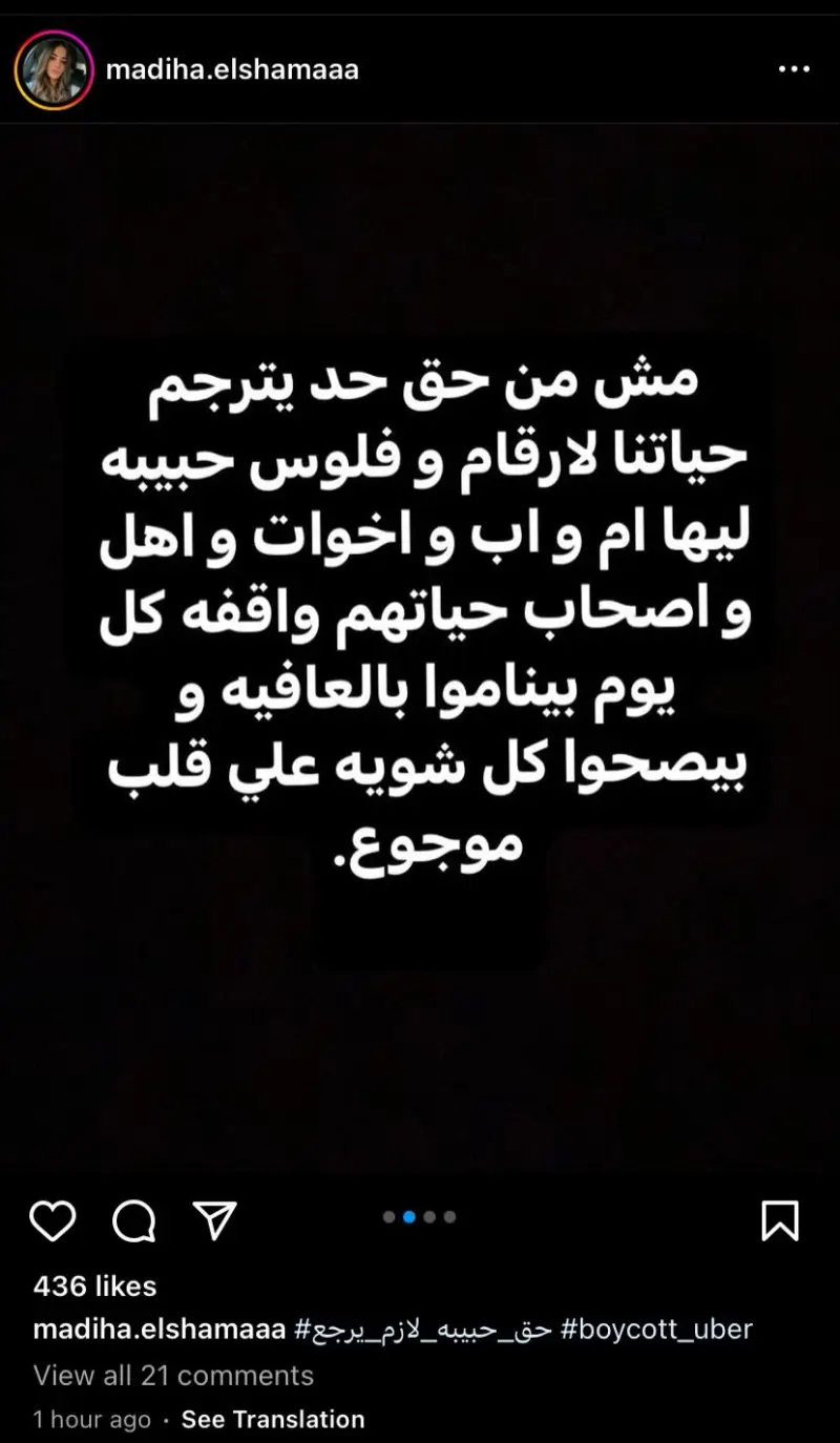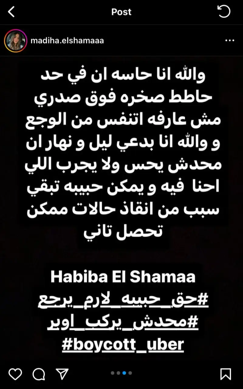 وقالت مديحة الشماع، أحد أفراد أسرة حبيبة فتاة الشروق، في منشور لها: "هو احنا دمنا رخيص أوي كده.. على فكرة حبيبة مش أول واحدة يحصلها كده، إحنا معانا ناس كتيرة أوي بأرقام محاضر في خلال السنتين الأخيرة تعرضوا لمواقف شبيهة، هنعمل إيه بتعويض وحياة الناس في خطر كل يوم، أنا عايزة أفهم إزاي أوبر مستثمرين وهما بياخدوا فلوس بالمصري".