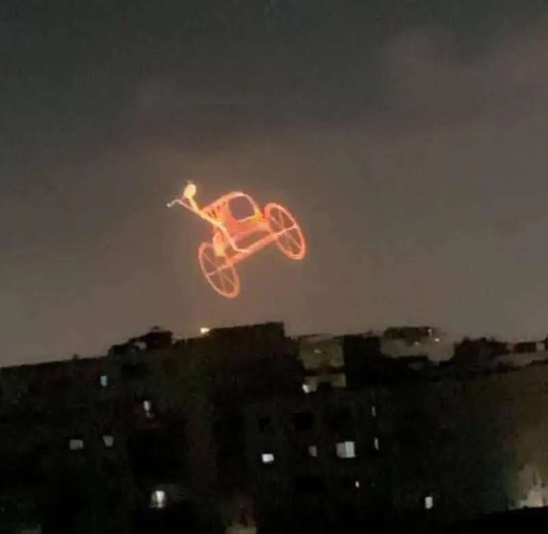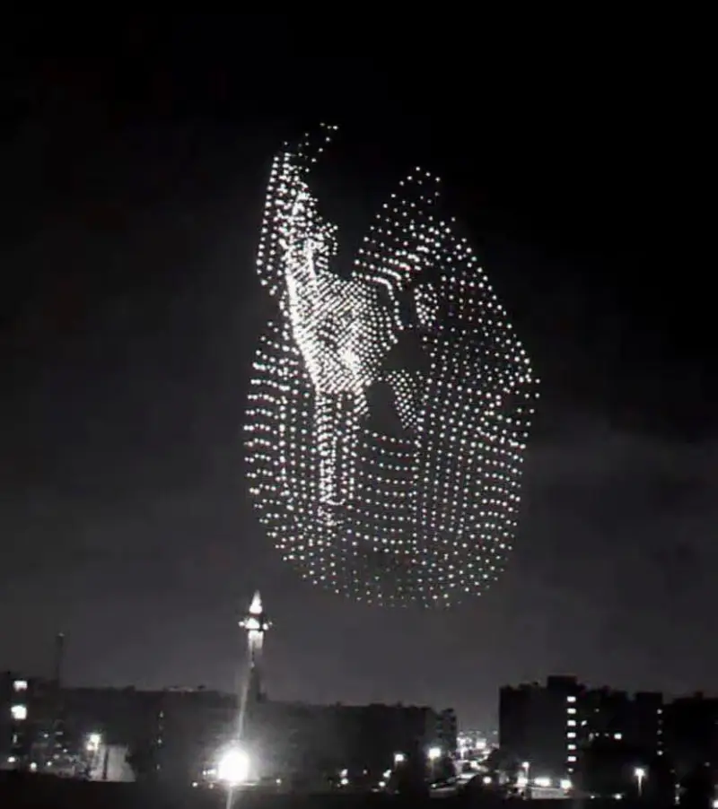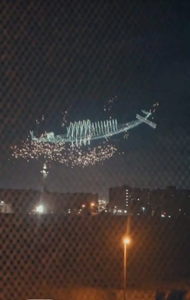لمعت سماء منطقة الجيزة وتحديداً مساحة الأهرامات والمتحف المصري الكبير، بعرض مبهر لرموز الحضارة الفرعونية مثل القناع الذهبي لتوت عنخ أمون والعجلات والسفن الحربية القديمة، بالإضافة إلى عدد آخر من رموز الفراعنة.