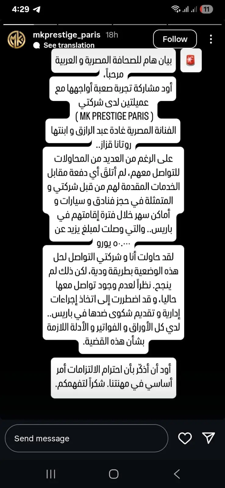 ونشرت شركة MK PRESTIGE PARIS عبر خاصية الاستوري على حسابها الرسمي على منصة إنستغرام بياناً للصحافة المصرية والعربية باللغتين العربية والإنجليزية اتهمت فيه الفنانة الشهيرة غادة عبد الرازق وابنتها روتانا قزاز برفض سداد فواتير شركة متخصصة في حجز الفنادق والسيارات وأماكن السهر خلال فترة تواجدهما في باريس.