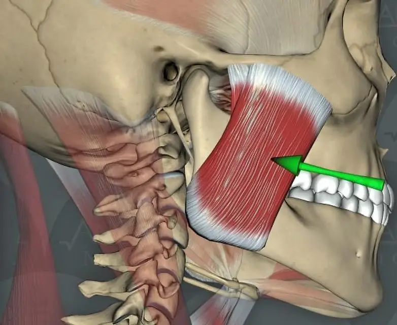 عضلة الفك: وظيفتها هي التحكم في عملية المضغ والضغط على الطعام قبل بلعه.