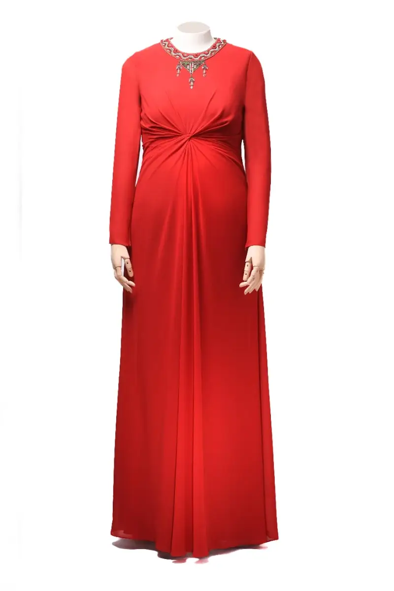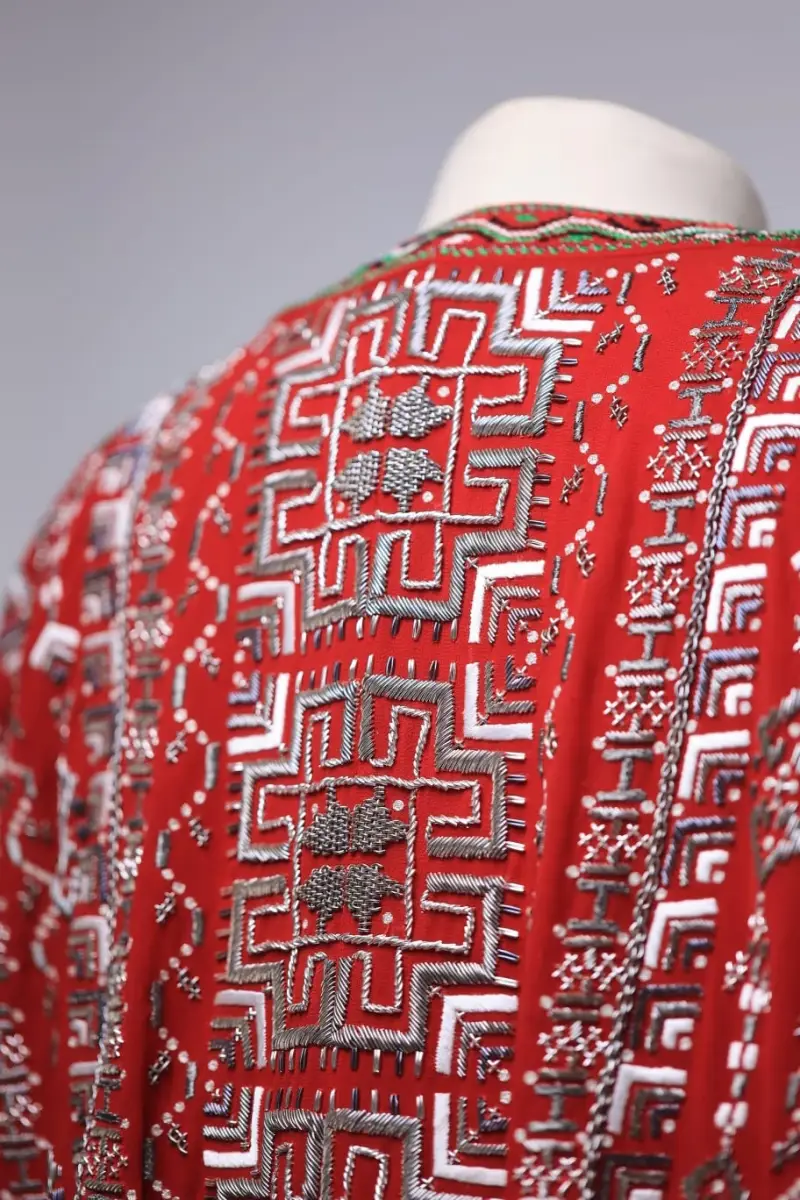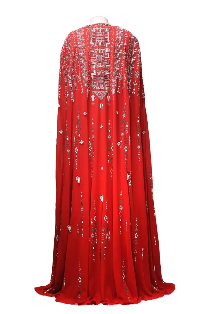 وتابعت: "تم التعاون لإنجاز جزء من تطريز الإطلالة مع حرفيات أردنيات للتطريز الأردني التقليدي حيث تم تطريز ياقة الفستان وأطراف الكاب يدوياً على أيادي حرفيات أردنيات في ما مجموعه 120 ساعة عمل لتزيين التصميم، استخدمن فيه الأدوات والأساليب التقليدية فبرزت أنماطًا متنوعة ومتشابكة شملت زخارف على أشكال هندسية عاكسة للتقاليد عبر الأزياء الوطنية، وبإشراف الدار عرض العمل الفني غرزات متقاطعة (غرزة ضرب - قطبة أردنية).