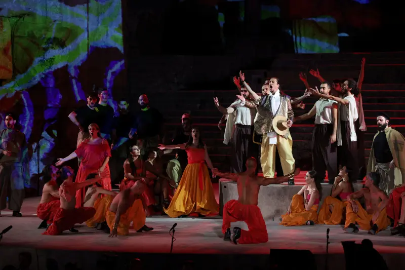 وجمعت أوبرا كارمن العالمية نحو 250 فنانا من العازفين والمغنين والراقصين على مدرج معبد باخوس تحت إدارة المخرج اللبناني جورج فيليب تقلا.