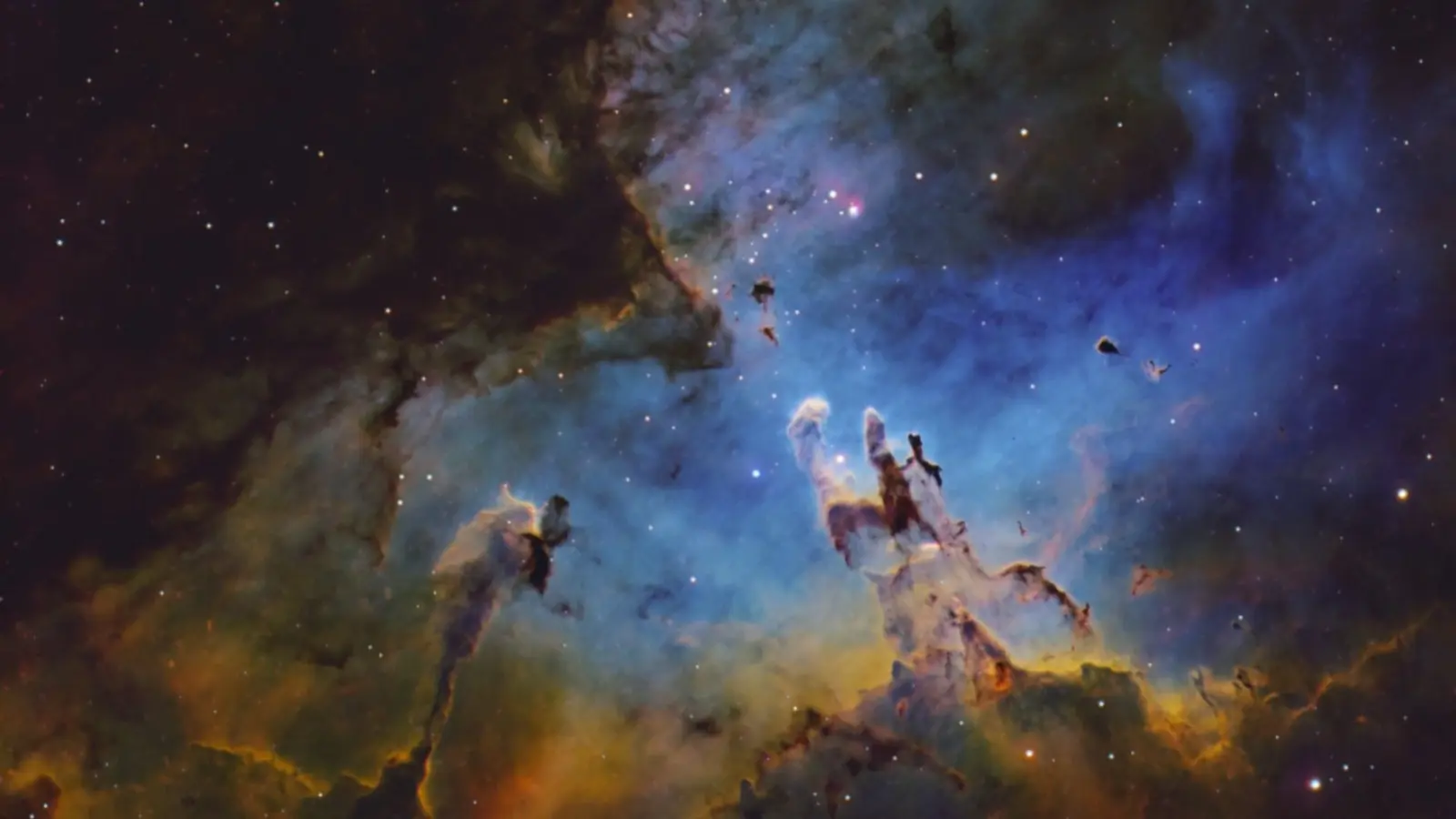 تظهر الصور ما يعرف بـ"أعمدة الخلق"، وهي تكوينات ضخمة من الغاز والغبار الكوني تتشكل بداخلها النجوم الحديثة.