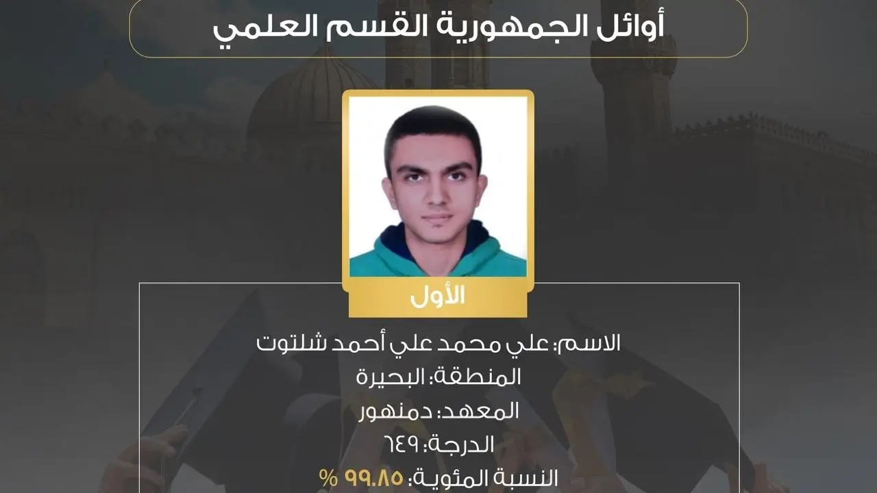 - الطالب علي محمد علي أحمد شلتوت من منطقة البحيرة الأزهرية في معهد دمنهور، حصل على المركز الأول بمجموع 649 درجة وهو ما يعادل نحو 99.85%.