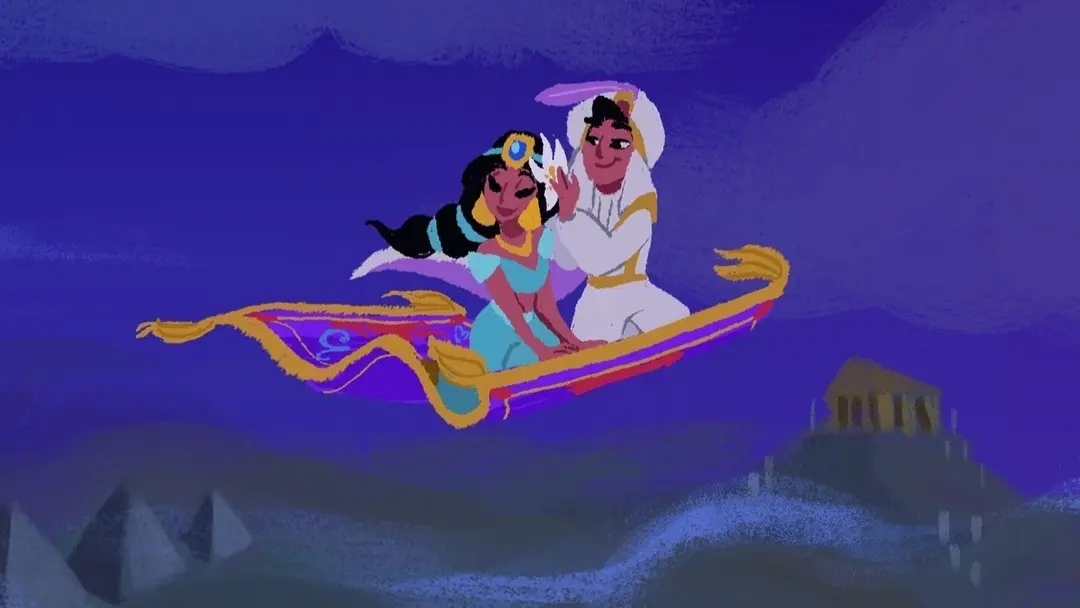 يقع علاء الدين وهو شخص عادي، في حب الأميرة ياسمين الذكية والواثقة من نفسها، لكن دورها في محاربة الساحر الشرير جعفر وإحباط خططه للاستيلاء على مملكة أغرابا، يجعل علاء الدين يرافقها في مهمتها الصعبة، ويتعلم من خلالها الكثير من الدورس، ويعتبر Aladdin من أشهر افلام ديزني.