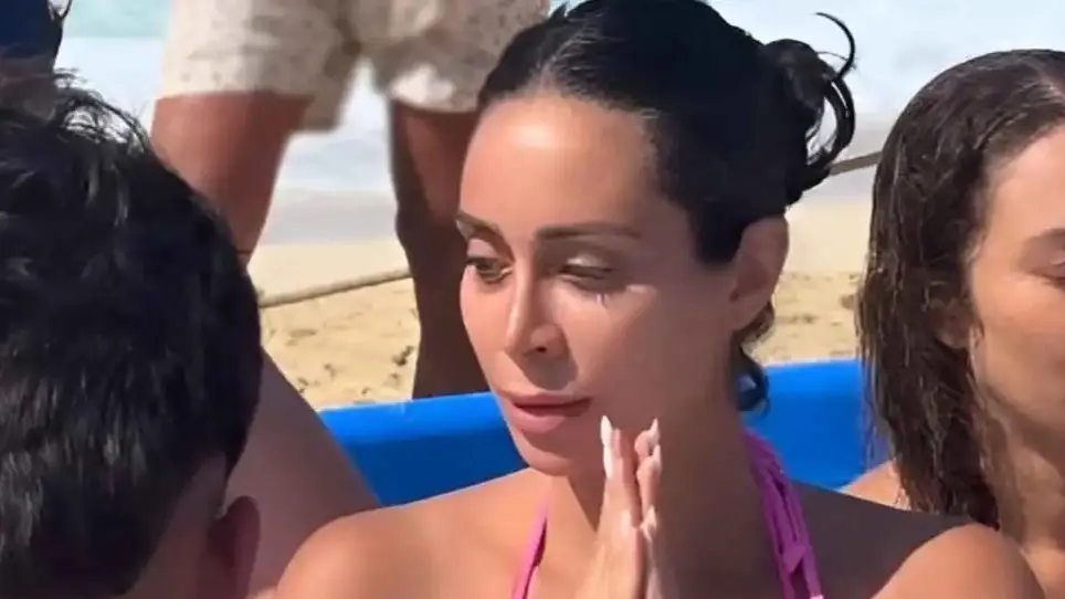 جلست الفنانة الشهيرة في حوض مياه كبير مليء بالثلج بجوار البحر، وظهر في نفس الحوض عدد من الأشخاص وكان الجميع يستمع إلى تعليمات المدرب التي يلقيها باللغة الإنجليزية.
