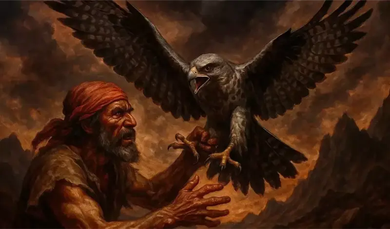 بينما هو سائر وجد راعيًا عند إبله، فسأله عن طيره، وإن كان قد رآه، فقال له الراعي إنه رأي طيران يتقاتلان أسفل الشجرة، فقرعهما بعصاه وذبحهما، وهما على النار ينتظر شواءهما، فعندما سمع صاحب الصقر هذا الكلام، أصيب بالحزن وانفجر في الراعي قائلا: "ماذا فعلت، أتشوي الصقر إنه لا يؤكل"، فما كان من الراعي إلا أن قال له: "صقر أو غيره كلها طيور"، فأطلق الرجل هذا المثل في الراعي قائلًا: اللي ما يعرف الصقر يشويه.