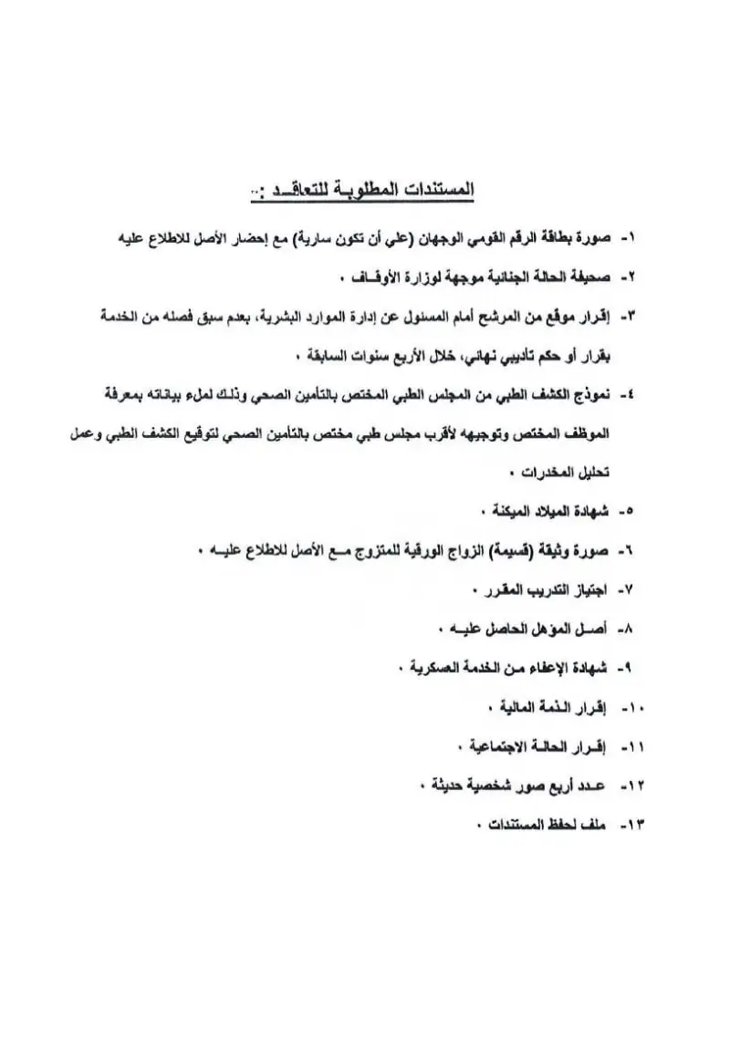 كشفت وزارة الأوقاف عن المستندات المطلوبة للتعاقد على الوظائف المتاحة ومنها: