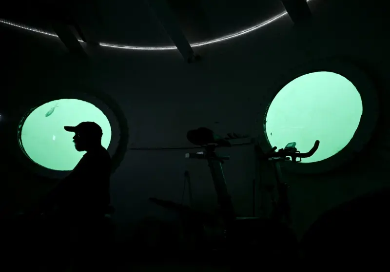 وأكّد أن "الأمر ليس صعبا"، قال "لا أعاني شيئا سوى الرغبة في السباحة أحيانا"، مشيرا إلى نوافذ دائرية لكبسولته يدخل منها الضوء الفيروزي، ومن خلالها يمكن رؤية الأسماك بكل الأحجام والألوان.