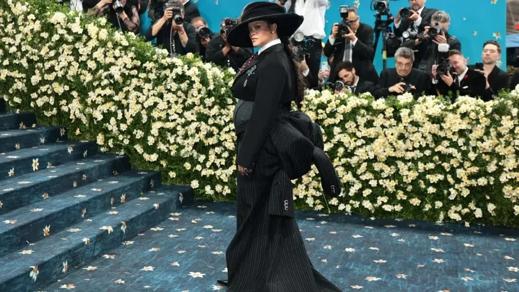وبعد وصول جميع الضيوف الآخرين، سارت ريهانا على السجادة الحمراء مرتديةً زيا أسود مُفككا مع سترة قصيرة وأكسسوارات منقطة وقبعة عريضة الحواف. وقد احتضنت بطنها المنتفخ وابتسمت للكاميرات.