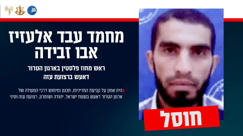 كما زعم البيان أن "أبو زبيدة شغل المنصب القيادي الأعلى في تنظيم داعش بقطاع غزة، وكان مسؤولًا عن تحديد السياسات، وتخطيط وتنفيذ طرق العمل الخاصة بالتنظيم داخل أراضي إسرائيل، في يهودا والسامرة، وفي قطاع غزة وسيناء".
