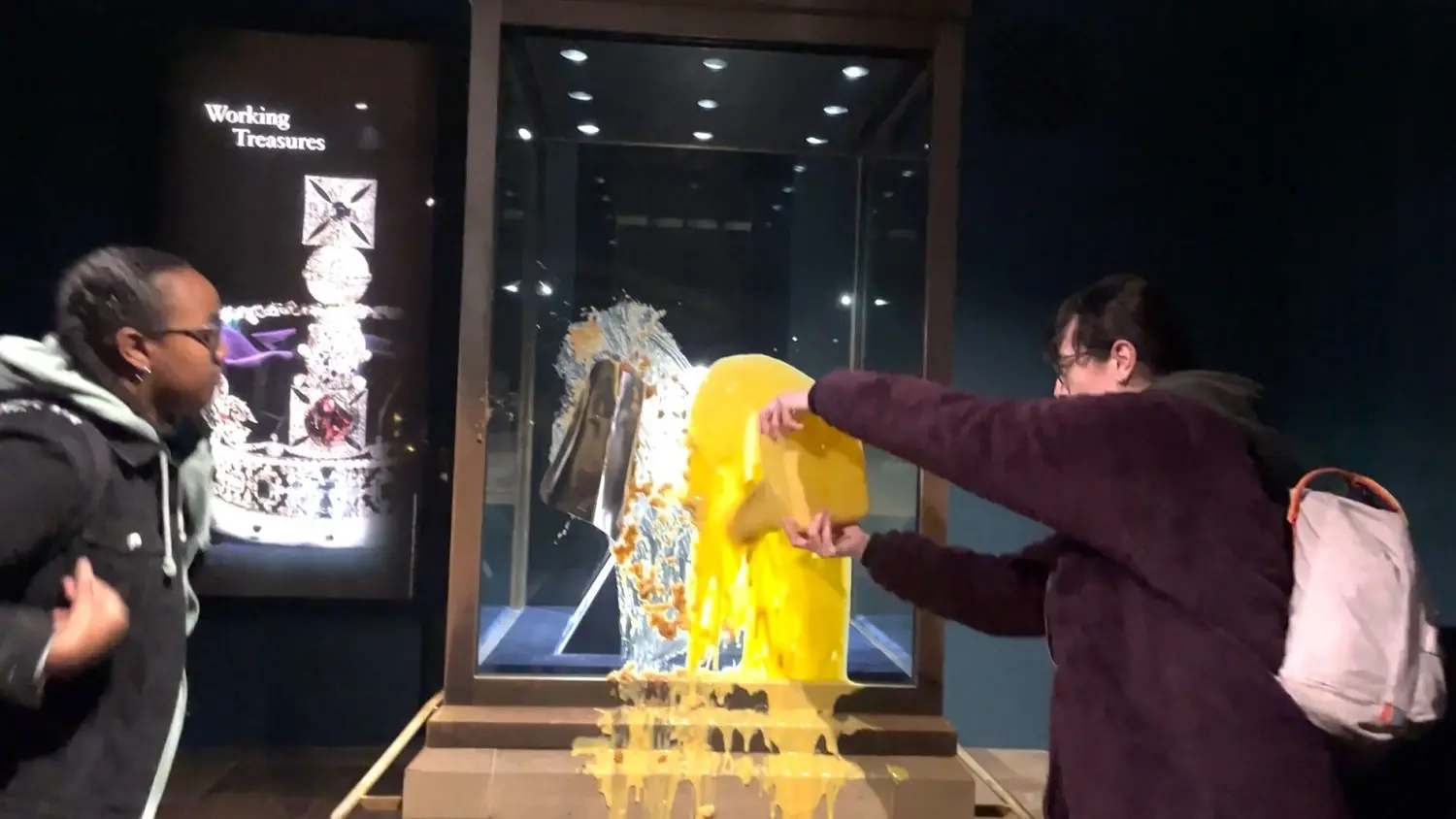 وفي مقطع الفيديو المنشور من "تايك باك باور" التي تعرّف عن نفسها بأنها مجموعة عصيان مدني سلمية، تظهر ناشطة تُخرج من حقيبتها وعاء لحفظ الطعام يحوي "كرامبل التفاح" ثم تسحقه بما فيه على واجهة "جواهر التاج"، فيما يُفرغ زميلها على الصندوق الزجاجي محتويات علبة كريما إنجليزية.