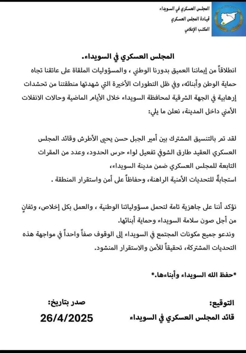 - نؤكد أننا على جاهزية تامة لتحمل مسؤولياتنا الوطنية، والعمل بكل إخلاص، وتفانٍ من أجل صون سلامة السويداء وحماية أبنائها.