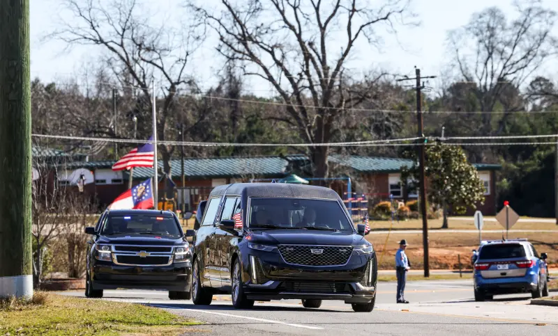 وترافق عائلة كارتر، بما في ذلك أبنائه الأربعة والعديد من أحفاده وأبناء أحفاده، كبير عائلتهم في موكب سينقل جثمانه عبر مسقط رأسه الذى كان محببا إلى قلبه بلينز، مرورا بمنزل طفولته، في طريقه إلى أتلانتا.