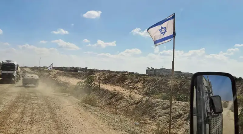 ويلاحظ وفق موقع "واينت" الإسرائيلي، صفّ من الأعلام الإسرائيلية يرفرف على طول المحور المركزي لممر نتساريم في الجزء الغربي منه وصولا إلى البؤرة الاستيطانية الكبيرة على الشاطئ جنوبي مدينة غزة في الشيخ عجلين.