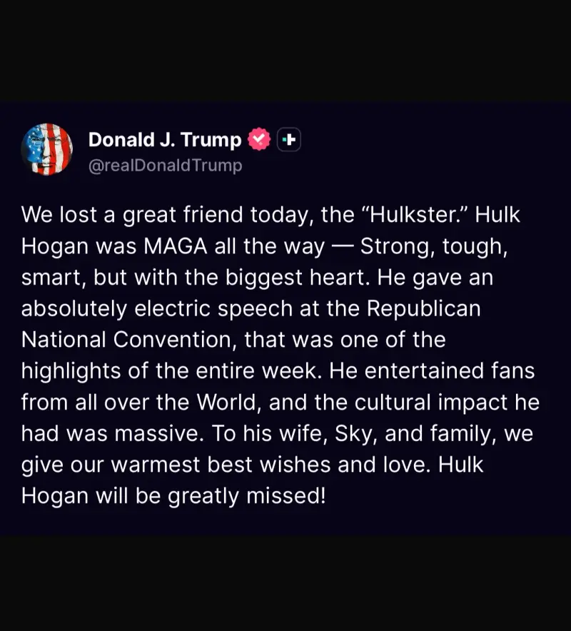 وكتب ترامب على حسابه بموقع (تروث سوشيال) "فقدنا اليوم صديقًا عزيزًا، لقد كان هالك هوجان رمزًا لشعار (لنجعل أميركا عظيمة من جديد) بكل معنى الكلمة. كان قويًا، صلبًا، ذكيًا، ولكنه يتمتع بقلب كبير".