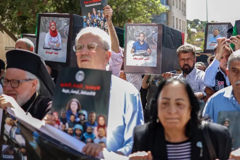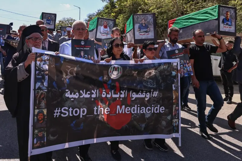 وشارك عشرات الصحفيين والمسؤولين الفلسطينيين في مسيرة باتجاه مبنى مقر الأمم المتحدة في رام الله، حاملين توابيت رمزية تحمل أسماء وصوراً لصحفيين قُتلوا في قطاع غزة منذ اندلاع الحرب في 7 أكتوبر 2023، من بينهم أنس الشريف.