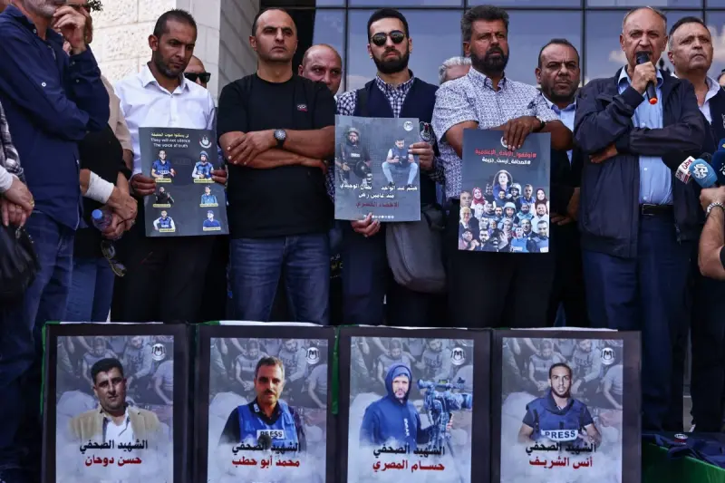 نظم صحفيون فلسطينيون ومسؤولون محليون الأربعاء وقفة احتجاجية في مدينة رام الله بالضفة الغربية ضد الاستهدافات الإسرائيلية للإعلاميين في غزة.
