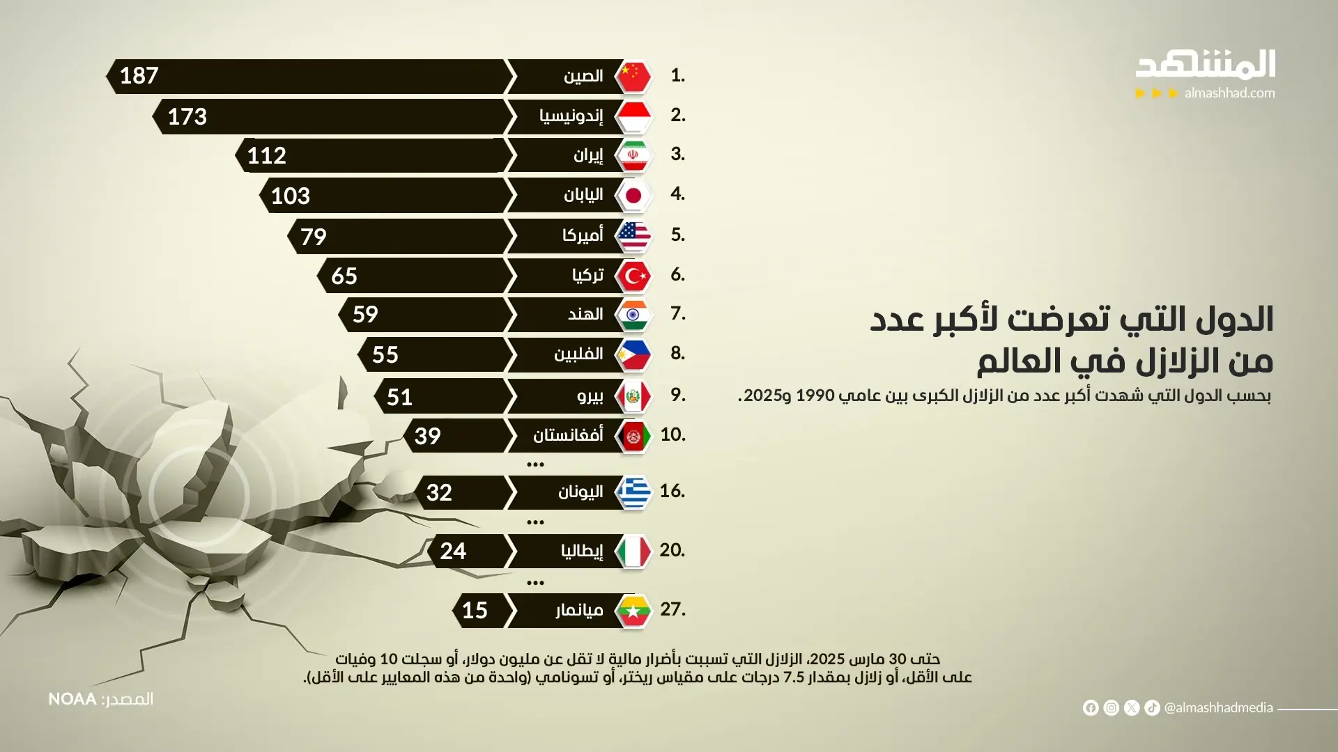 كشفت الإدارة الوطنية للمحيطات والغلاف الجوية الأميركية (noaa) عن قائمة بأكثر الدول التي تعرضت لأكبر عدد من الزلال خلال آخر 25 عاما.