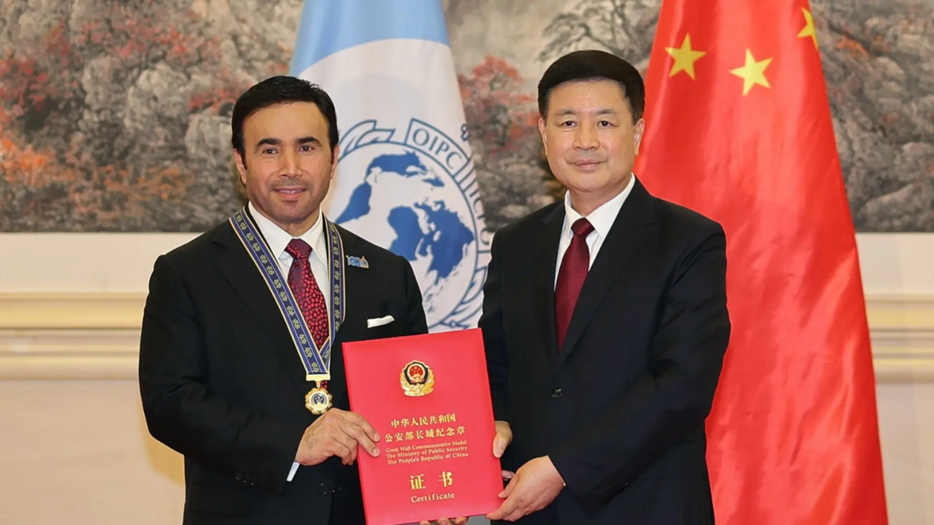 منحت الصين، رئيس المنظمة الدولية للشرطة الجنائية (الإنتربول) اللواء الدكتور أحمد ناصر الريسي، "وسام السور العظيم من الطبقة الذهبية" وهو أرفع وسام أمني تمنحه وزارة الأمن العام الصينية وذلك خلال مراسم رسمية أُقيمت في العاصمة بكين بحضور عضو مجلس الدولة ووزير الأمن العام الصينيوانغ شياوهونغ، على ما أفادت وكالة أنباء الإمارات (وام).