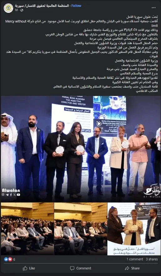 غير أن تحقيق إعلامي لمنصة "تأكد" المتخصصة بكشف الحقائق وفضح التزييف، كشف العكس تماما: المنظمة غير مدرجة في أي سجل من سجلات الأمم المتحدة، ولا تظهر في قوائم المجلس الاقتصادي والاجتماعي (إيكوسوك) أو مجلس حقوق الإنسان، كما نفت الأمم المتحدة في سوريا أي صلة بها.