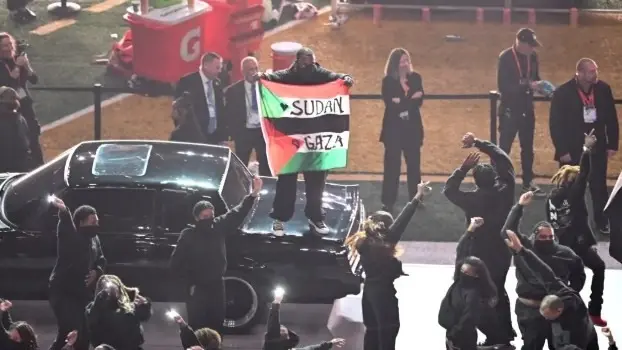 انتشر على مواقع التواصل الاجتماعي مقطع فيديو يُظهر قيام متظاهر برفع العلم الفلسطيني خلال عرض مغني الراب كندريك لامار في سوبر بول الأميركي قبل القبض عليه من قبل رجال الأمن.